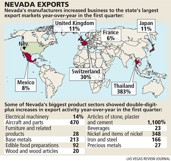 A few countries that haven't traditionally done big business with Silver State firms advanced the share of Nevada goods they bought in the first quarter.