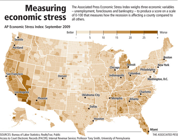 The Associated Press calculates its index on a scale of 1 to 100 using unemployment, foreclosure and bankruptcy rates. A region qualifies as stressed when its score surpasses 11. Analysts attributed nationwide improvement in stress scores to stabilized bankruptcy and foreclosure numbers.