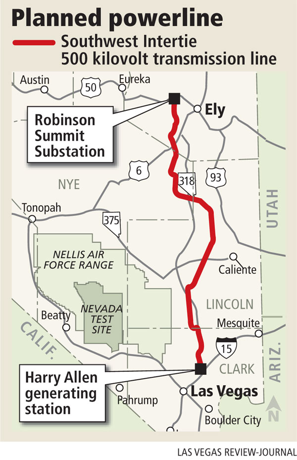 The local electric utility hopes to swap out a proposal for its One Nevada transmission line (ONLine) and go instead with LS Power's Southwest Intertie Project, a competing transmission line following the same 235-mile route from Ely to NV Energy's Harry Allen Generating Station in Apex. At a press conference Monday morning at Harry Allen, Senate Majority Leader Harry Reid, D-Nev., and executives with NV Energy and LS Power announced an agreement to give NV Energy co-ownership of the 500-kilovolt line and full access to its distribution capacity.