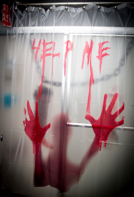 The thematic decor continues throughout the house: dangling body parts suspended from the dining room ceiling. The powder room has been transformed into a bath of horrors, with knives, saws and a severed arm suspended from the ceiling. As an added touch, a severed head sits countertop next to the black vessel sink, and fake blood drips from the mirror.