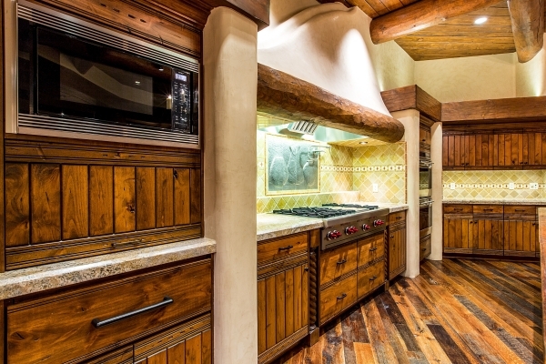 The kitchen, which is fully open to the great room, is a stunner. Its centerpiece is a sizeable island with a sink. It is topped with mesquite wood and was crafted in Tucson. Along with providing an immense area for food preparation, there is a handy sink. Overhead, a rustic-styled, chain-suspended candelabra makes a statement, as do the butcher block's carved legs below. An inlayed, pressed tin oven backdrop, showing a trio of traditional clay pots, adds a sense of artistic whimsy, as do the colorful wall tiles from Santa Fe.