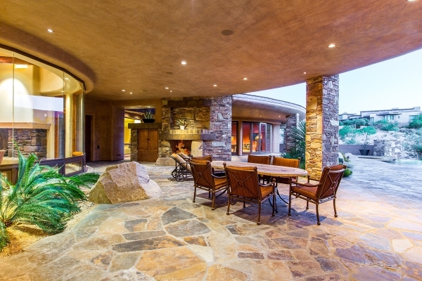 Continuing with flagstone floor construction, much of the inviting layout is sheltered by curved eaves, a key in quality desert living.