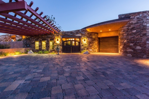 The home blends seamlessly with its Mojave ecosystem surroundings. At the front, a dual driveway greets residents and visitors. A lower passage leads to a four-car garage for storing personal automobiles and delivery access for caterers and other service providers. The upper causeway is an enormous, flagstone-paved courtyard for guest parking. It is accented with a huge lattice pergola for shading cars.