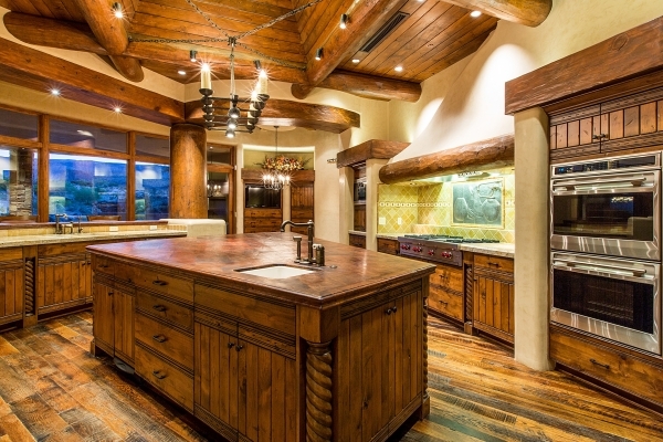 FEATURES: The Southwestern-styled mansion features striking mountain views from the floor-to-ceiling windows. It has many curved walls, massive cylindrical timber beams and pillars and reclaimed oak wood floors. It also has a theater, upgraded kitchen and pool.