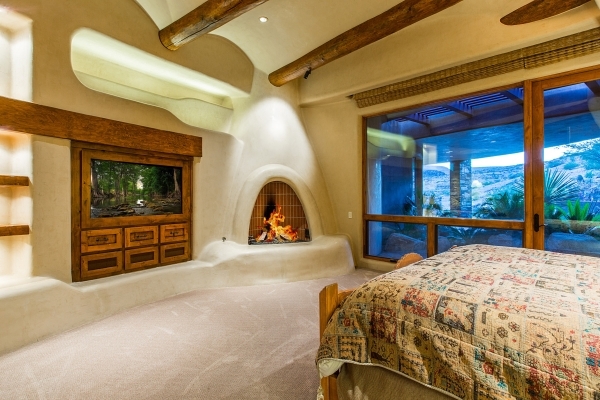 While the core of the main floor is mostly wide open with an unobstructed view, the master bedroom provides a private place all its own. In an airy, well-lit space, the kiva-inspired walls carry an inherent den-like sense of comfort. The suite is enhanced by a beehive fireplace, a comfortable window nook for reading and a distinctive adobe arch over the bed area fitted with micro-spotlight fixtures.