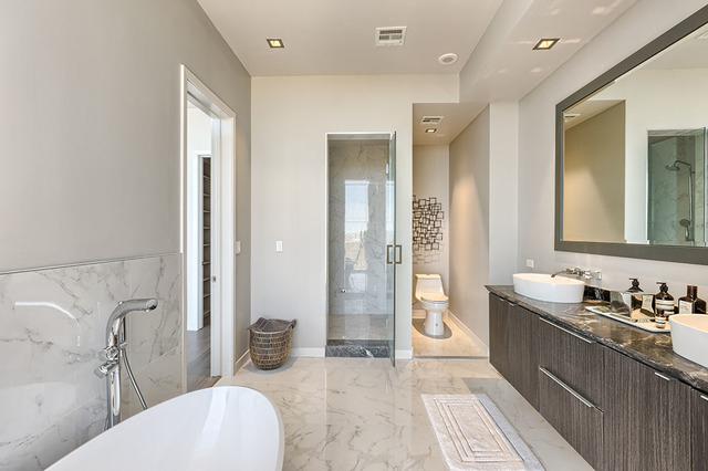 The main master bath features a high-end Victoria + Albert contemporary style oval tub. The second master has a Kohler soaking tub. Both have Danze faucets and custom-built vanities with granite countertops.