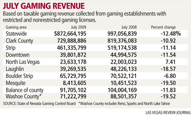 The news was equally bad around the rest of the state. Washoe County's revenue total of $71.2 million in July was the Northern Nevada county's lowest single-month total since 1987. Washoe County also recorded its 25th straight monthly decline.