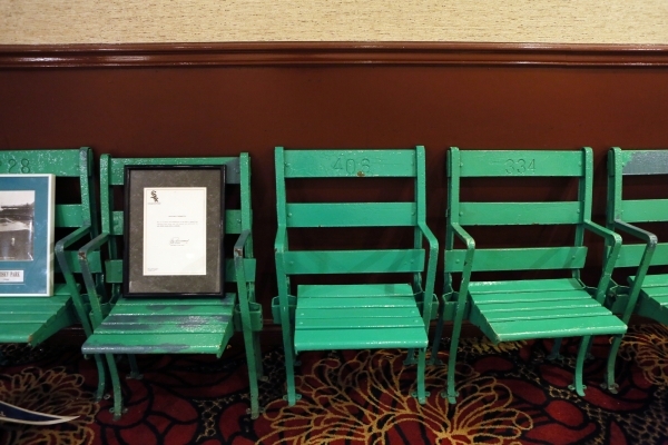 Among the items featured for sale include a signed Michael Jordan University of North Carolina Tar Heels basketball jersey; a framed Pete Rose No. 14 Montreal Expos jersey, flanked by a photo of the baseball great as a member of the Philadelphia Phillies and his official Cincinnati Reds' baseball card; two official seats from Comiskey Stadium in Chicago; and an autographed bat collection from the 1946-1958 World Series games.