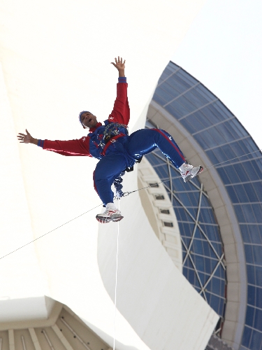 The $1.1 million ride drops 855 feet from a platform above Las Vegas Boulevard to a deck just above the hotel's porte cochere.