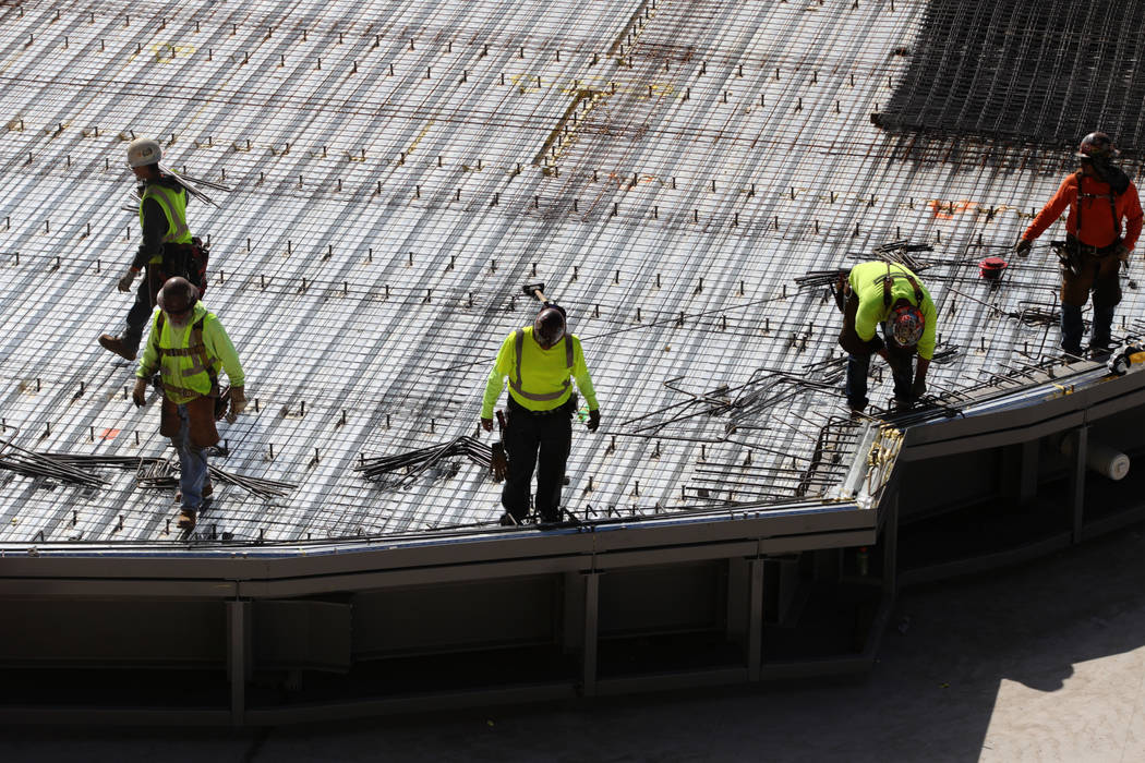 Construction workers prepare a section of the field tray to pour cement at the Raiders Allegiant Stadium in Las Vegas, Tuesday, Feb. 18, 2020. (Erik Verduzco/Las Vegas Review-Journal) @Erik_Verduzco