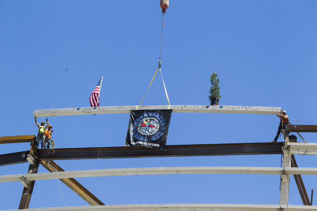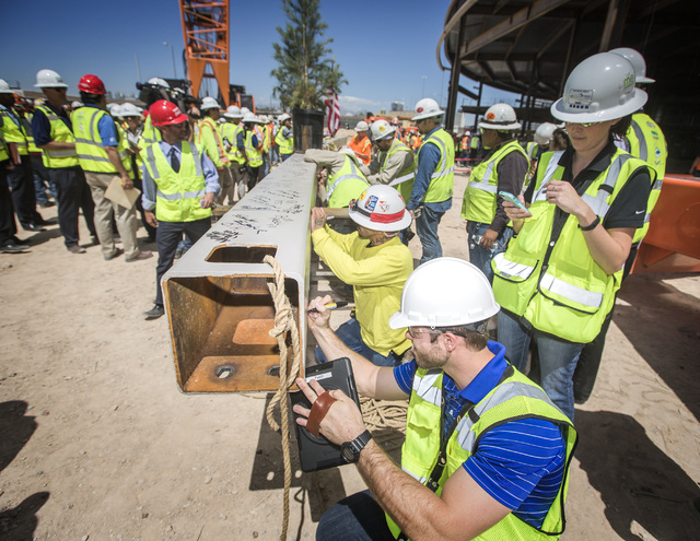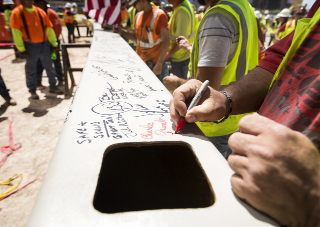 County Commissioners Steve Sisolak and Mary Beth Scow also joined company officials and several hundred construction workers to sign the final beam for the “steel topping off” event.