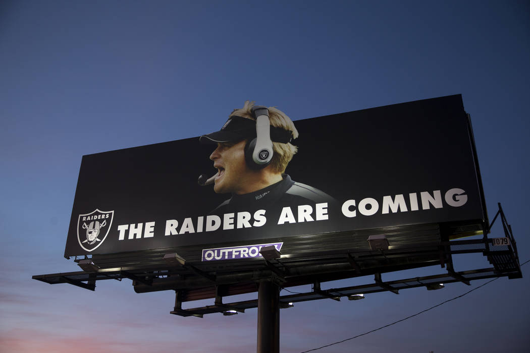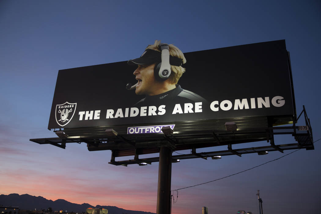 The sign, facing south, simply states, “THE RAIDERS ARE COMING.” Gruden’s image is above the message, with a Raiders logo at the left.