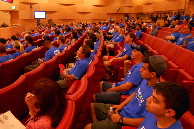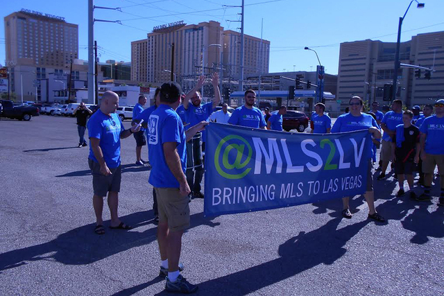 Before the soccer stadium discussion, about 100 pro soccer stadium fans marched along Main Street and gathered in a parking lot near Las Vegas City Hall. The pro-soccer stadium fans dressed in blue T-shirts under the “MLS2LV” umbrella — Major League Soccer to Las Vegas. They began filing into the City Hall meeting room at mid-morning.