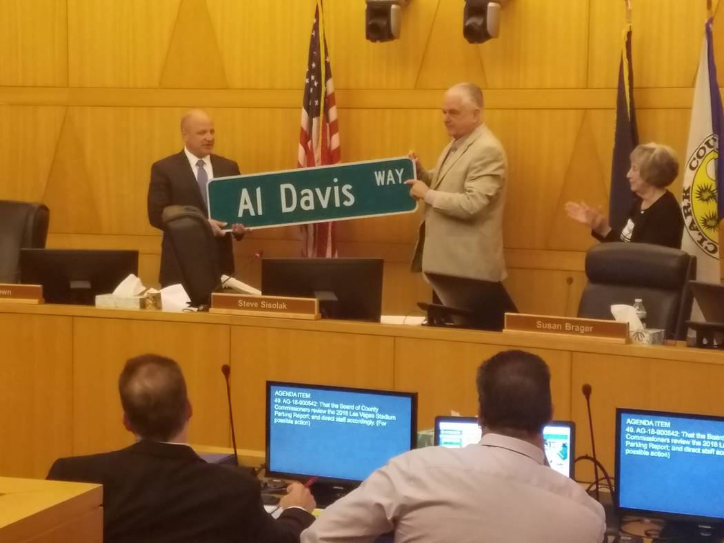 After the hearing, Commission Chairman Steve Sisolak presented Badain with a green “Al Davis Way” street sign for a road near the stadium honoring the late owner of the Raiders.
