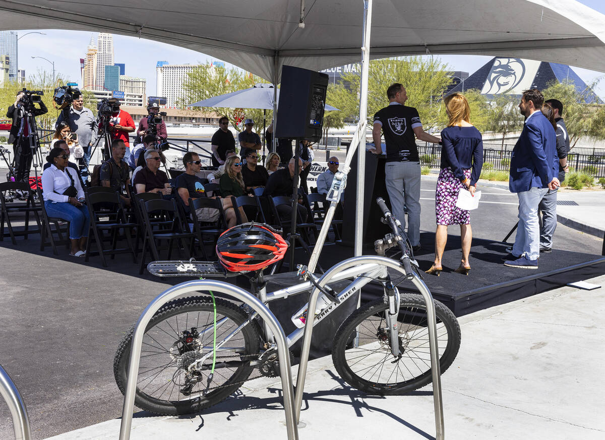 The Raiders unveiled new bicycle racks and suggested bike paths at an event Thursday afternoon at Allegiant Stadium.