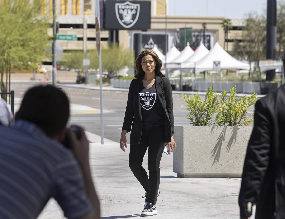Raiders President Sandra Douglass Morgan arrives to participate in the unveiling ceremony for new bike racks and designated bike travel paths outside of Allegiant Stadium, on Thursday, April 20, 2023, in Las Vegas. Bizuayehu Tesfaye Las Vegas Review-Journal) @btesfaye