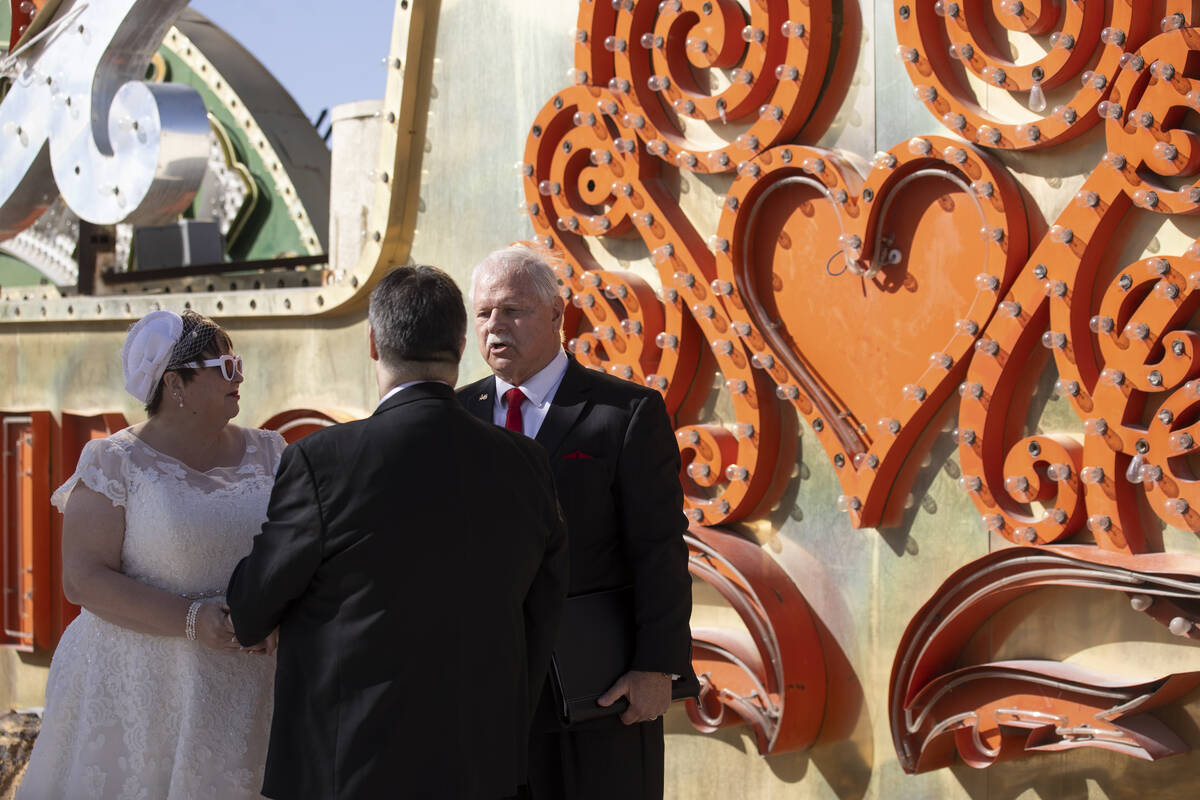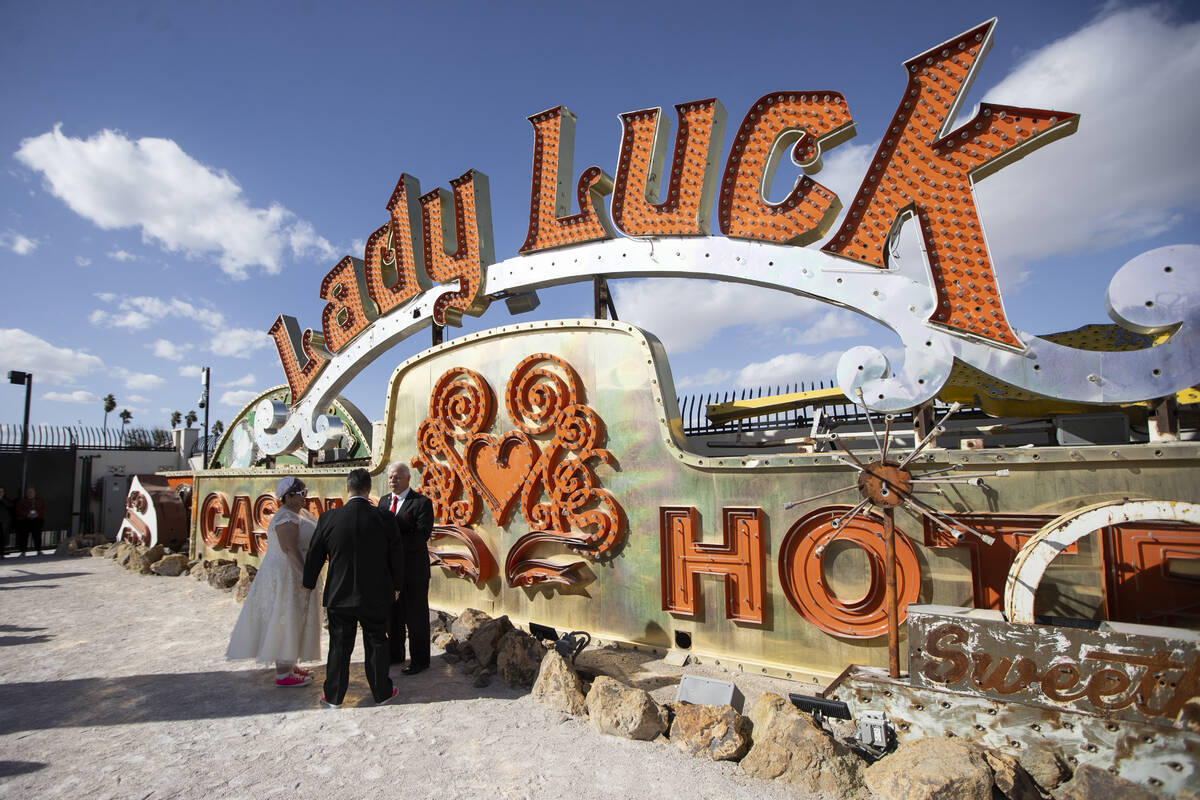 The Tampa, Florida, couple loves a good story, and the pair began a new chapter together Tuesday at the Neon Museum north of downtown Las Vegas.