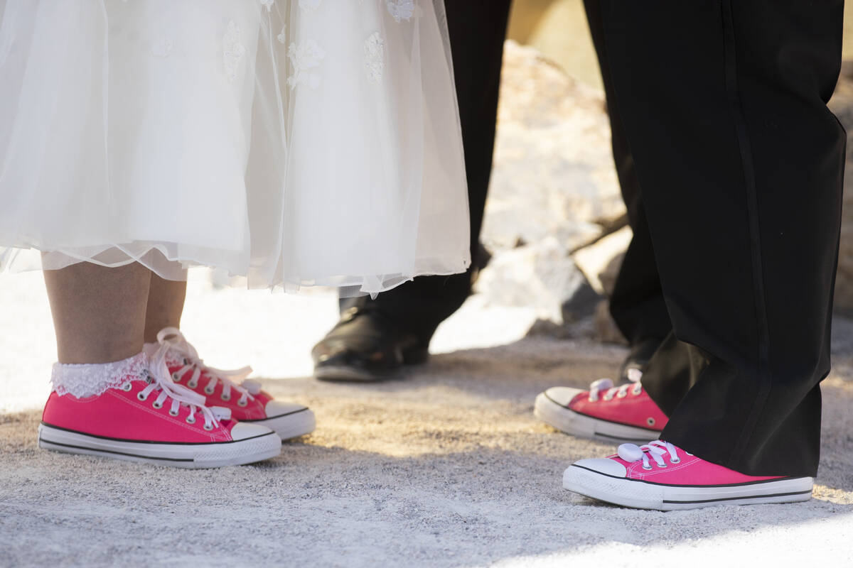 Ansoleaga bought her a pair for her birthday one year, and Hippensteel, anticipating gravelly Las Vegas ground, suggested tennis shoes to wear at the wedding. They bought two new pairs so each would have a pristine set for their big day. The couple affixed small light-up squares to their shoelaces ahead of their Tuesday night wedding reception at Black Tap inside The Venetian.