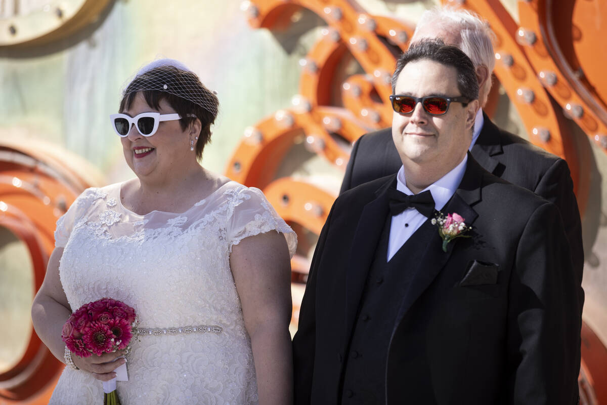 They see themselves as a nontraditional couple, so they didn’t want a “cliche” wedding in a ballroom, hotel or church. Mission accomplished. No bridesmaids, no groomsmen, no chapel, a solo walk down the aisle for Hippensteel and a picturesque neon boneyard backdrop. They said they liked the numerology, and Hippensteel added that she preferred a workweek wedding day.