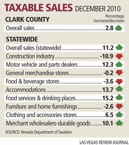 Nevada's merchants improved their taxable sales in the month by 11.2 percent, moving nearly $4.1 billion in tangible goods in the month, the state Department of Taxation reported Wednesday. That's up from $3.7 billion in December 2009.