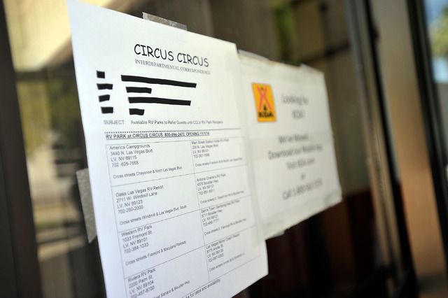 A memo alerting guests that the former KOA RV park at Circus Circus is closed is seen posted on the door of the park office on Friday, Oct. 3, 2014. MGM Resorts International announced this week the Circus Circus RV park had closed and would be renovated to include 170 spaces. Some of the parkճ land will be used for the $40 million open-air concert venue that MGM Resorts is creating on 40 acres at the corner of Sahara Avenue and the Strip. (David Becker/Las Vegas Review-Journal)