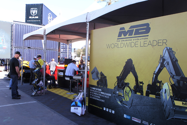 Dozens of show attendees gathered around the MB display booth during demonstrations, watching as an excavator swung from and maneuvered along a small hill of broken concrete.