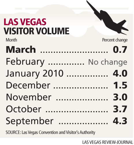 Las Vegas welcomed 3.22 million tourists in the month, up 0.7 percent from March 2009, according to new numbers from the Las Vegas Convention and Visitors Authority. It's the seventh straight month of increased or flat visitor volumes, following a 15-month string of declines that began in May 2008.