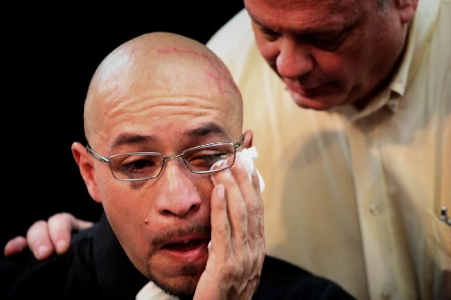 His 9-year-old son, Cristopher , helps him with the words and offers him tissues to wipe his wet eyes and nose. He offers him a sip of water when he stumbles.