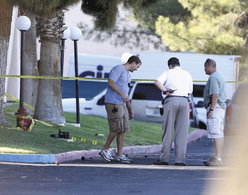 Thursday afternoon, several plainclothes officers stood around an area on the southeast corner of the hotel-casino, on Boulder Highway at Twain Avenue, where three evidence markers were placed in the grass outside one of the hotel buildings.