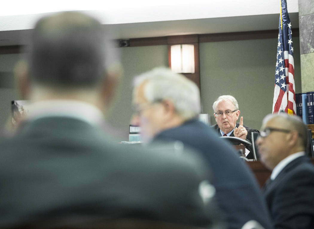 Judge Mark R. Denton, third from left, responds to a motion during magician David Copperfield’s civil trial at the Regional Justice Center on Monday, April 30, 2018, in Las Vegas. Benjamin Hager Las Vegas Review-Journal @benjaminhphoto