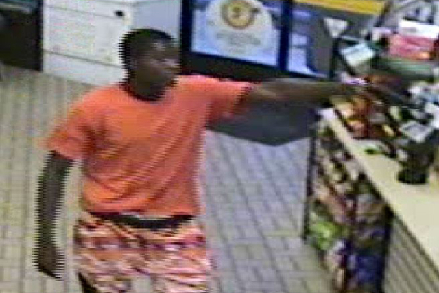 Metro released pictures Tuesday night of a man they said jumped over the counter and robbed two employees with a semi-automatic handgun before running away with the money. The late-night release did not include additional information, but Metro dispatch logs show the robbery occurred about 7:44 p.m. on Aug. 8 at the Green Valley Grocery at 7121 E. Lake Mead Blvd.
