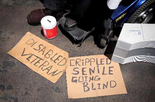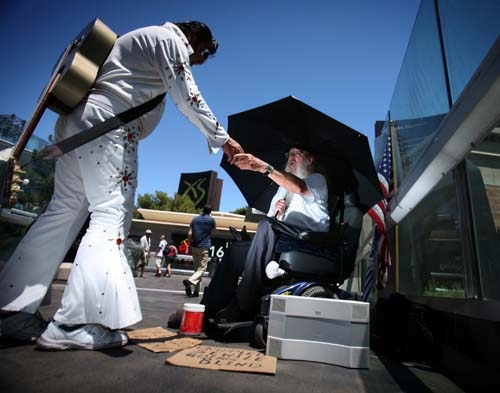 He sat in a wheelchair on the pedestrian bridge between the Palazzo and Wynn Las Vegas handing out water. A donation jar and a sign saying he was a disabled veteran were nearby. Passers-by could give donations if they wanted to, but that didn't determine whether they got water. He said he knows he can't charge for it - that's illegal.