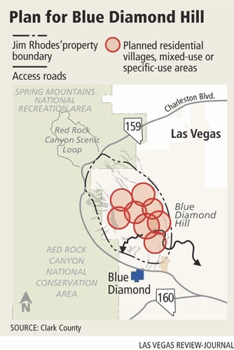 When Rhodes bought the land and a gypsum mine on the site in 2003, state lawmakers, led by then-Senate Majority Leader Dina Titus, moved quickly to prevent him from seeking a zoning change. It was, and still is, zoned for rural use, which restricts development to up to 1,500 homes. Rhodes wanted a zoning change that would allow him to build up to 4,700 homes.