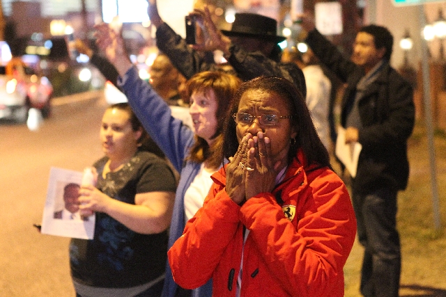 The sad scene unfolded after 7 p.m. and was punctuated by intermittent bursts of water from the Bellagio fountain and tourists snapping photos, seemingly without knowledge of what the flashing cab lights commemorated.