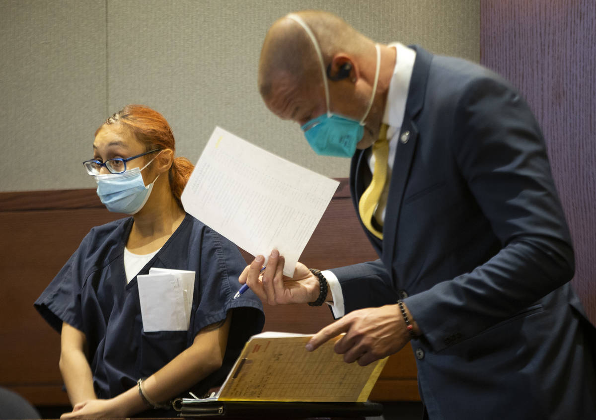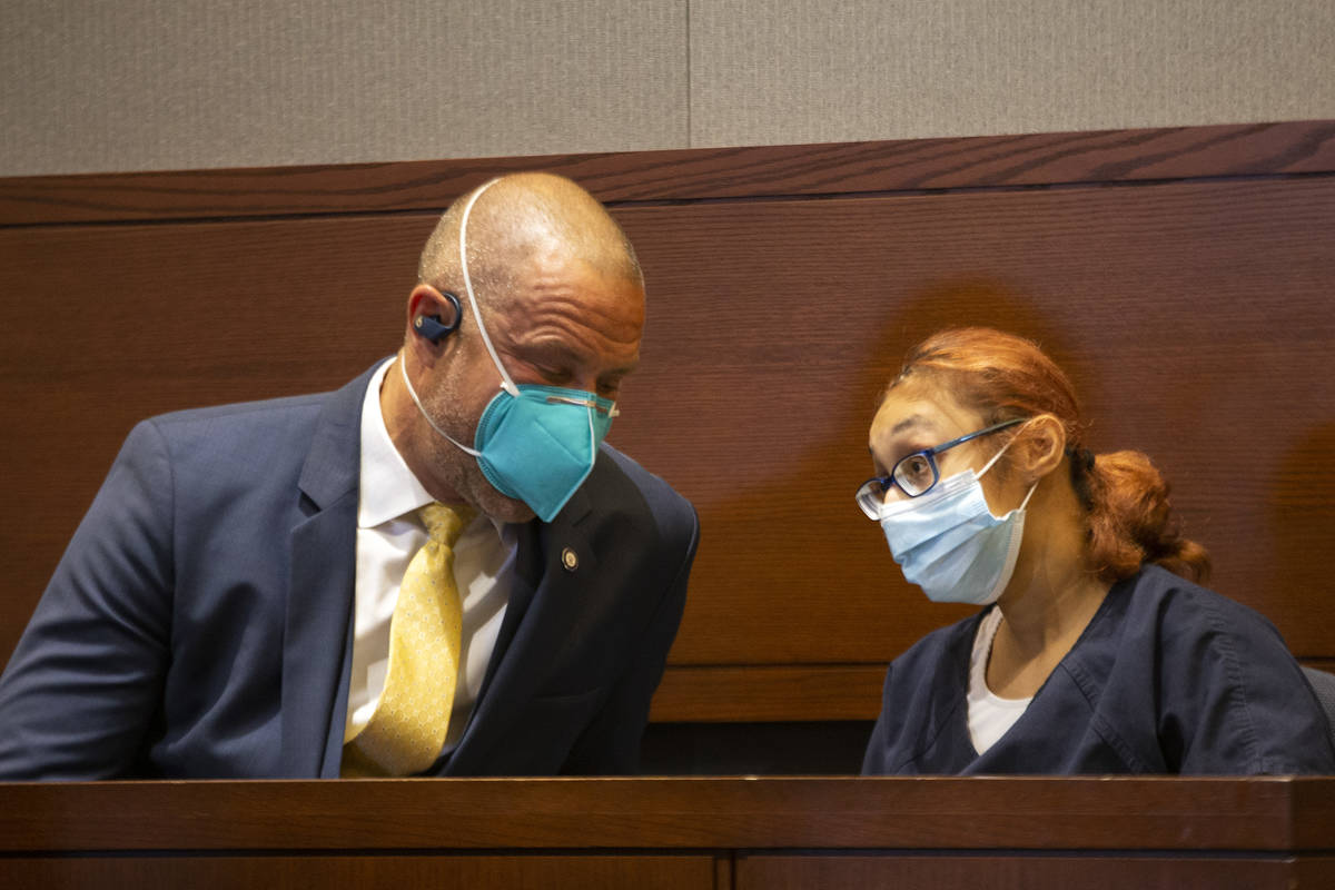 Jasmin Vargas communicates with her attorney, David Fischer, during a court hearing at the Regional Justice Center on Tuesday, Jan. 5, 2021, in Las Vegas. Vargas faces charges of child abuse or neglect in the fatal shooting of her 3-year-old son. (Ellen Schmidt/Las Vegas Review-Journal) @ellenschmidttt