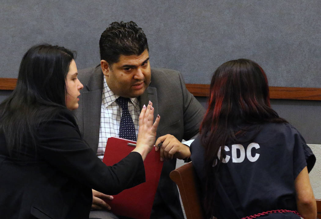 Gigi Mitchell, accused of trafficking an 11-year-old girl, appears in court with her defense attorneys Mike Feliciano, right, and Ashley Sisolak during her preliminary hearing at the Regional Justice Center on Tuesday, July 30, 2019, in Las Vegas. (Bizuayehu Tesfaye/Las Vegas Review-Journal) @bizutesfaye