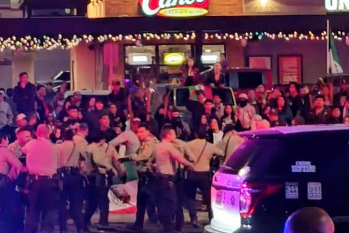 Martin Rodriguez filmed a video he uploaded to social media that shows officers taking two people into custody amid commotion. Mexican flags and flying water bottles could be seen in the distance.