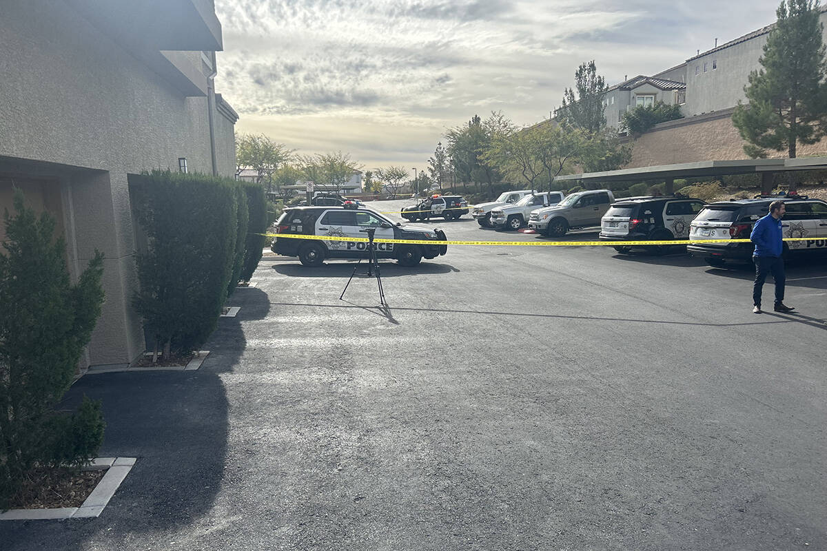 Late Monday morning, police had taped off a section of the parking lot and a building in the southwest corner of the complex. Along with officers, several Metropolitan Police Department vehicles, unmarked police vehicles, and a Clark County School District Emergency Management vehicle were parked outside.
