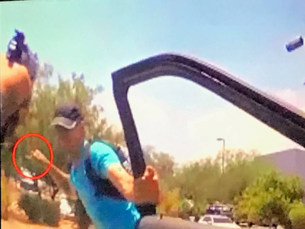 The man, identified as 27-year-old Caleb Edward Blaylock of Las Vegas, then appeared to grab the patrol car door frame with his left hand while holding the 10-inch knife in his right hand, at which point the officer shot twice.