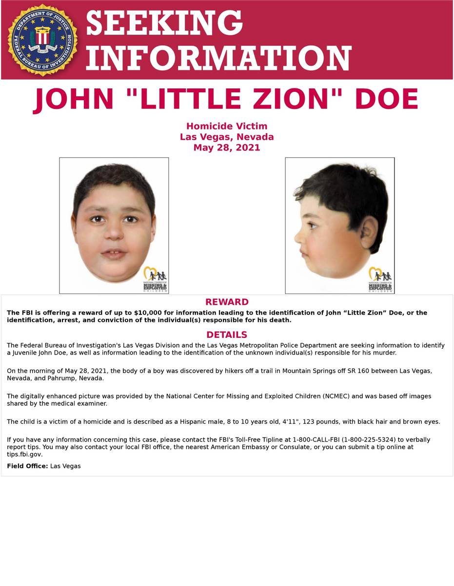 The #FBI and @LVMPD are seeking information about the death of John "Little Zion" Doe, whose body was discovered in Mountain Springs, Nevada, on May 28. Visit https://t.co/iL7sD5efWD to submit a tip. #SeekingInfoSaturday @FBILasVegas https://t.co/vFockrnJIQ pic.twitter.com/F15YNYTjzJ