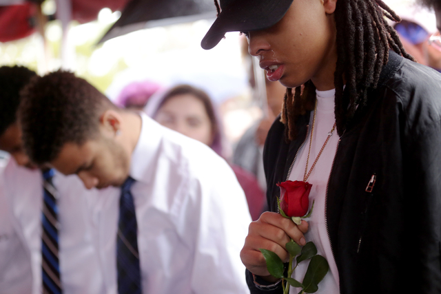 About 125 people attended the half-hour service Thursday in front of Chaparral High School in Las Vegas.