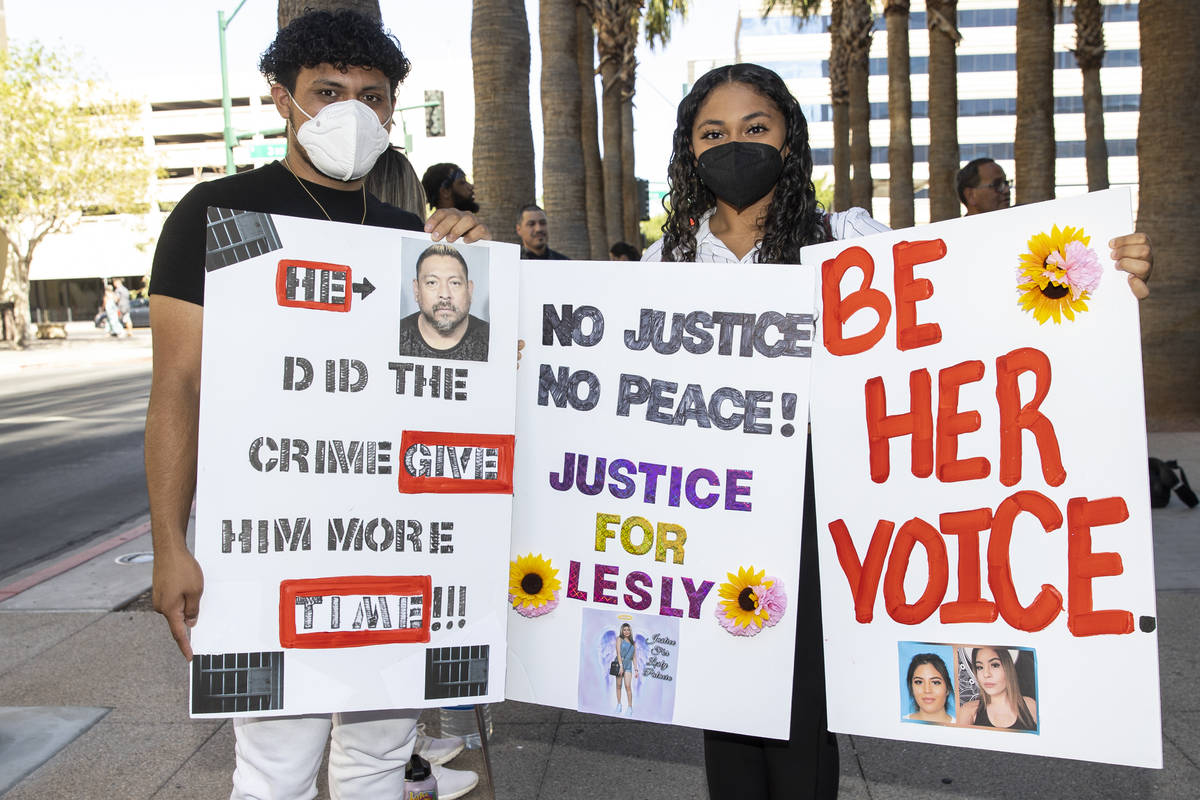 Dozens protested Friday outside Las Vegas Justice Court, shedding tears and demanding a harsher sentence for the man who pleaded guilty last week to helping hide the body of a local woman found dead in the desert last year.