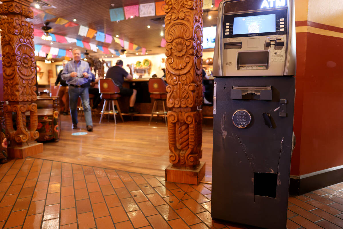 The ATM at Lindo Michoacan at 10082 W. Flamingo Road in Las Vegas is shown Tuesday, Aug. 30, 2022. The restaurant’s manager said a male broke through a window and used tools to break into the ATM and safe. (K.M. Cannon/Las Vegas Review-Journal) @KMCannonPhoto