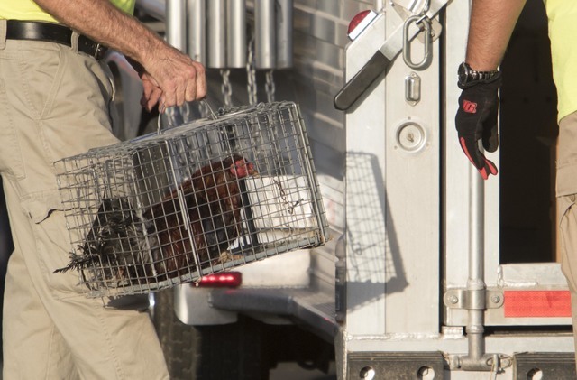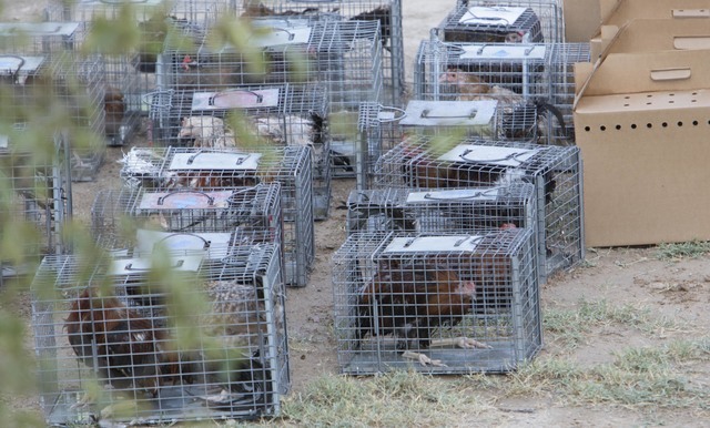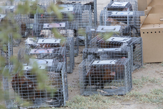 Two men, Javier Salgado and Silvester Gayton, were each arrested Aug. 3 in connection with the breeding operation and charged with owning roosters related to fighting, a felony in Nevada. About 600 birds were recovered.