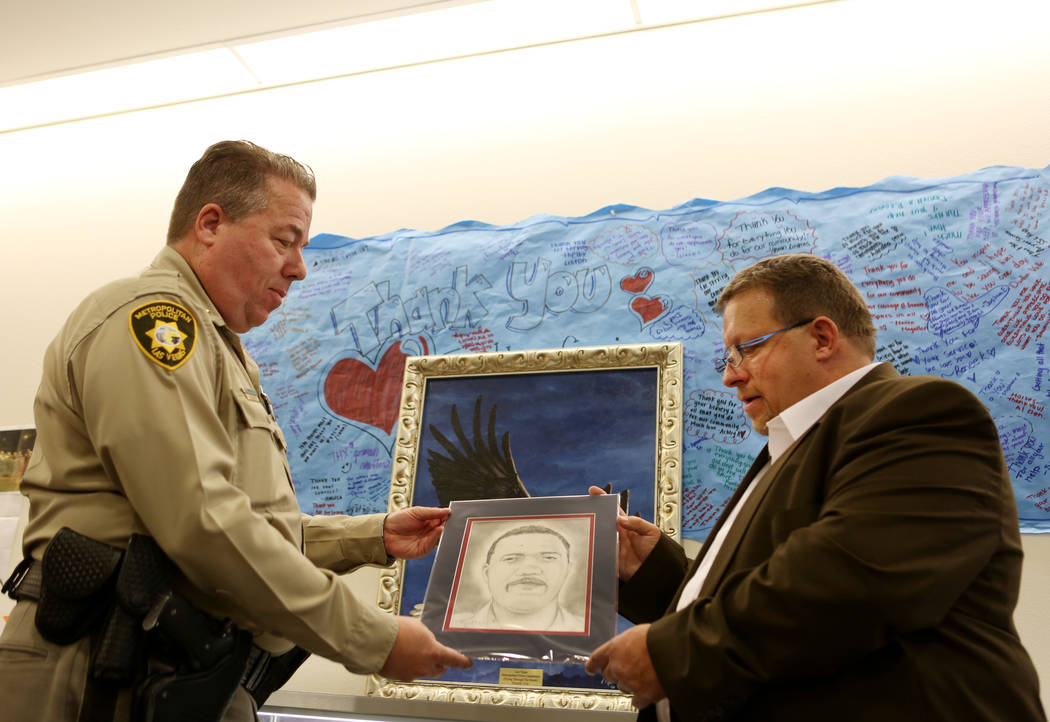 Metro spokesman Jay Rivera confirmed the painting and Hartfield’s portrait will remain on display inside the Las Vegas police headquarters’ main lobby.