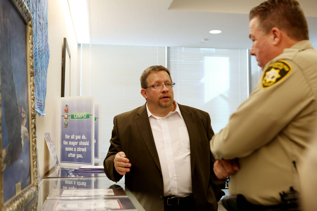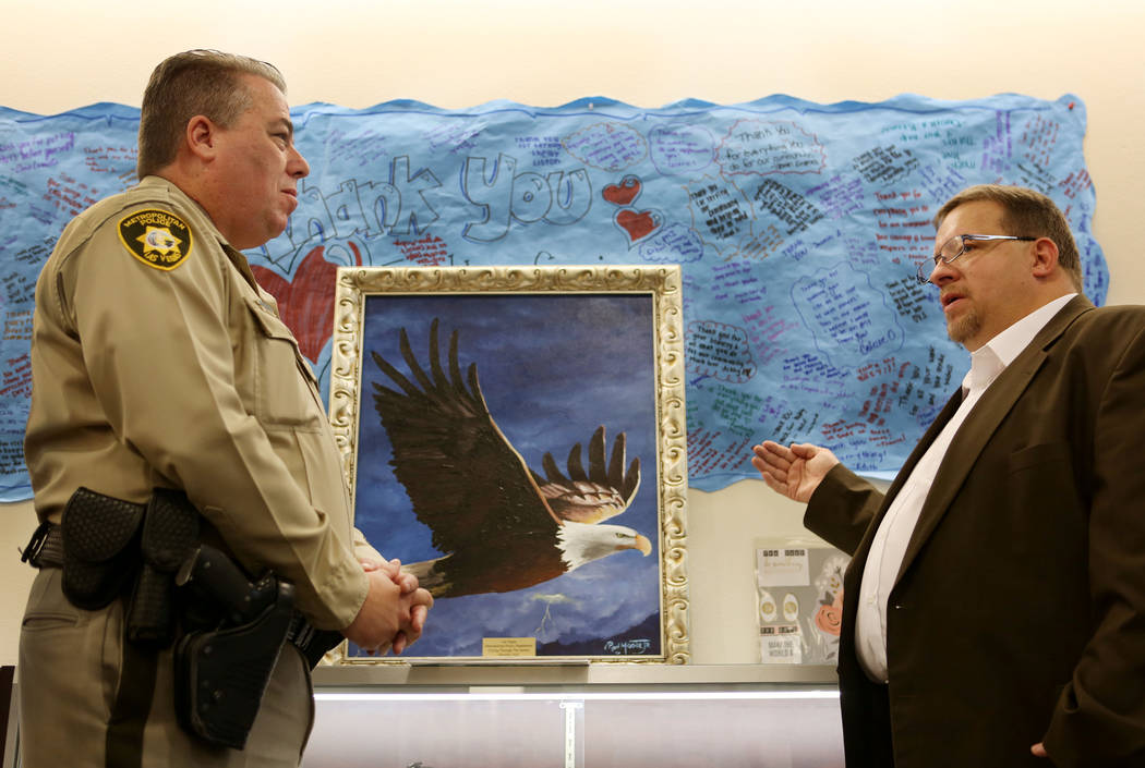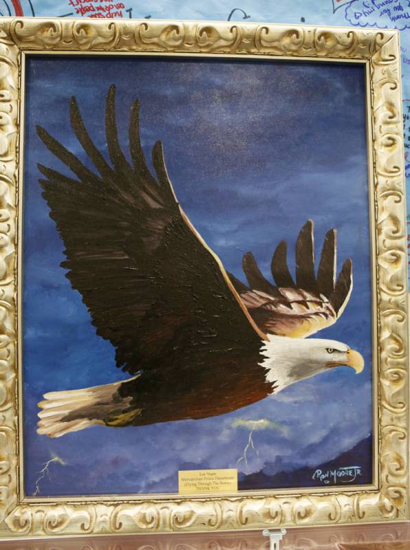 An added surprise to the Las Vegas police from Moore, the large acrylic painting of the eagle had arrived at the headquarters on Martin Luther King Boulevard days before Moore and McGrath were scheduled to meet. On Tuesday morning, the artist added the final touch to his gift: a gold plaque with the artwork’s title, “Flying Through The Storm.”