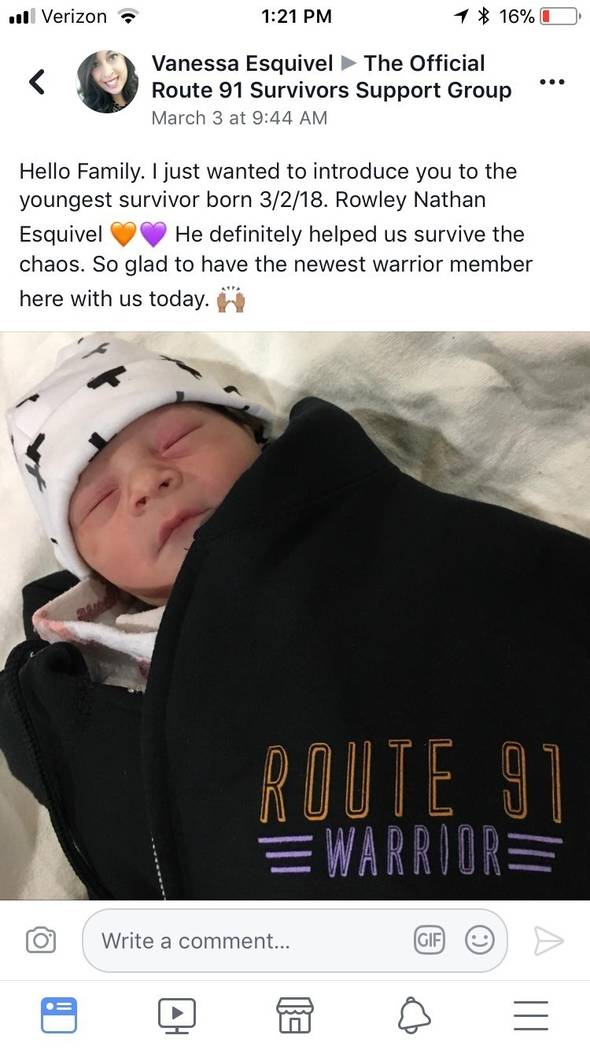 Esquivel and her husband, Mikey, welcomed their first child, Rowley Nathan, on March 2. The next day, she went onto the Official Route 91 Survivors Support Group and posted a picture of the baby wrapped in a sweatshirt from the festival.