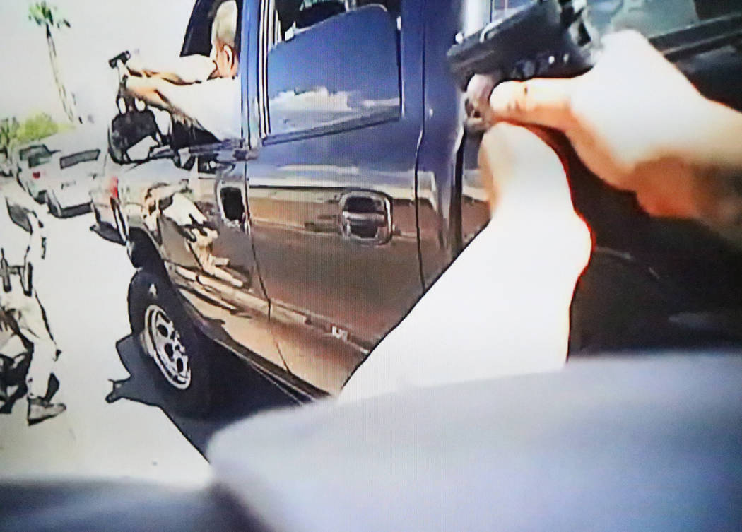 A man who died in his truck Tuesday during a confrontation with Las Vegas police was shot by an officer and not himself, the Clark County coroner’s office said Friday.