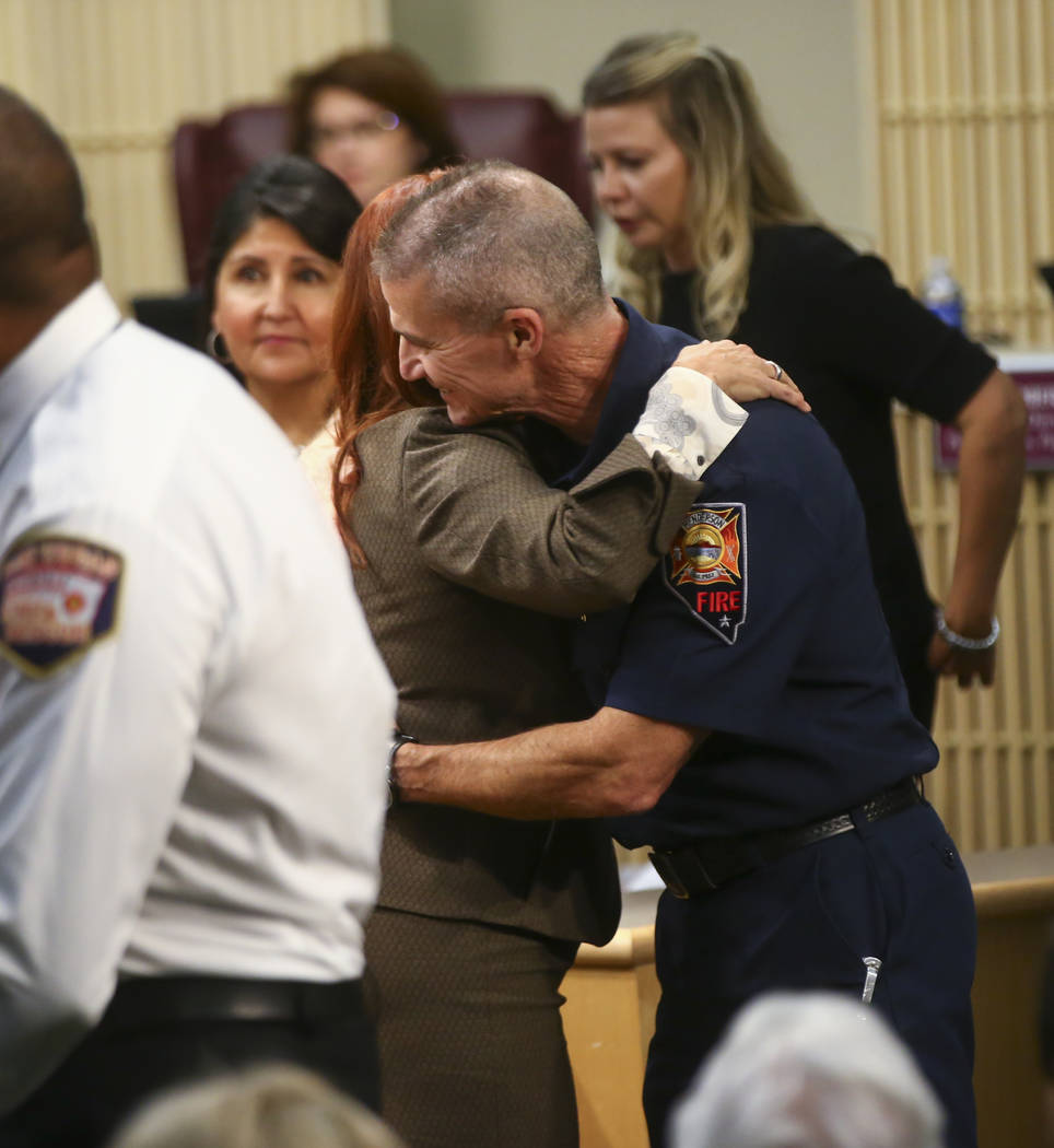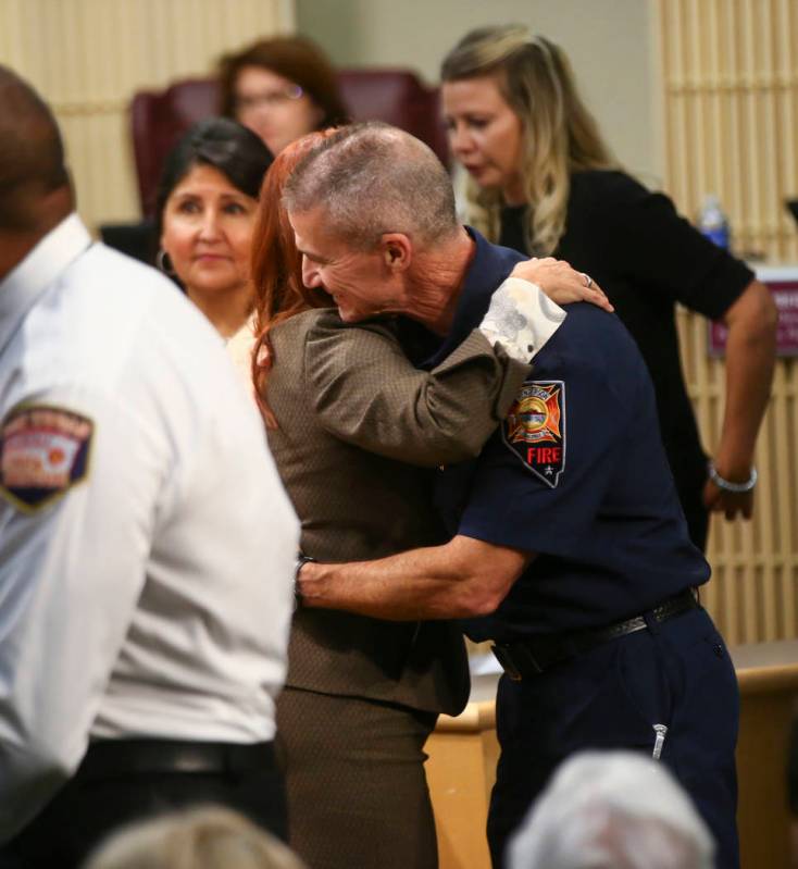 Henderson Fire Department Chief Shawn White, right, is embraced by Henderson Mayor Debra March as first responders in the Oct. 1 shooting are recognized during a Henderson City Council meeting on Tuesday, Oct. 17, 2017. Chase Stevens Las Vegas Review-Journal @csstevensphoto
