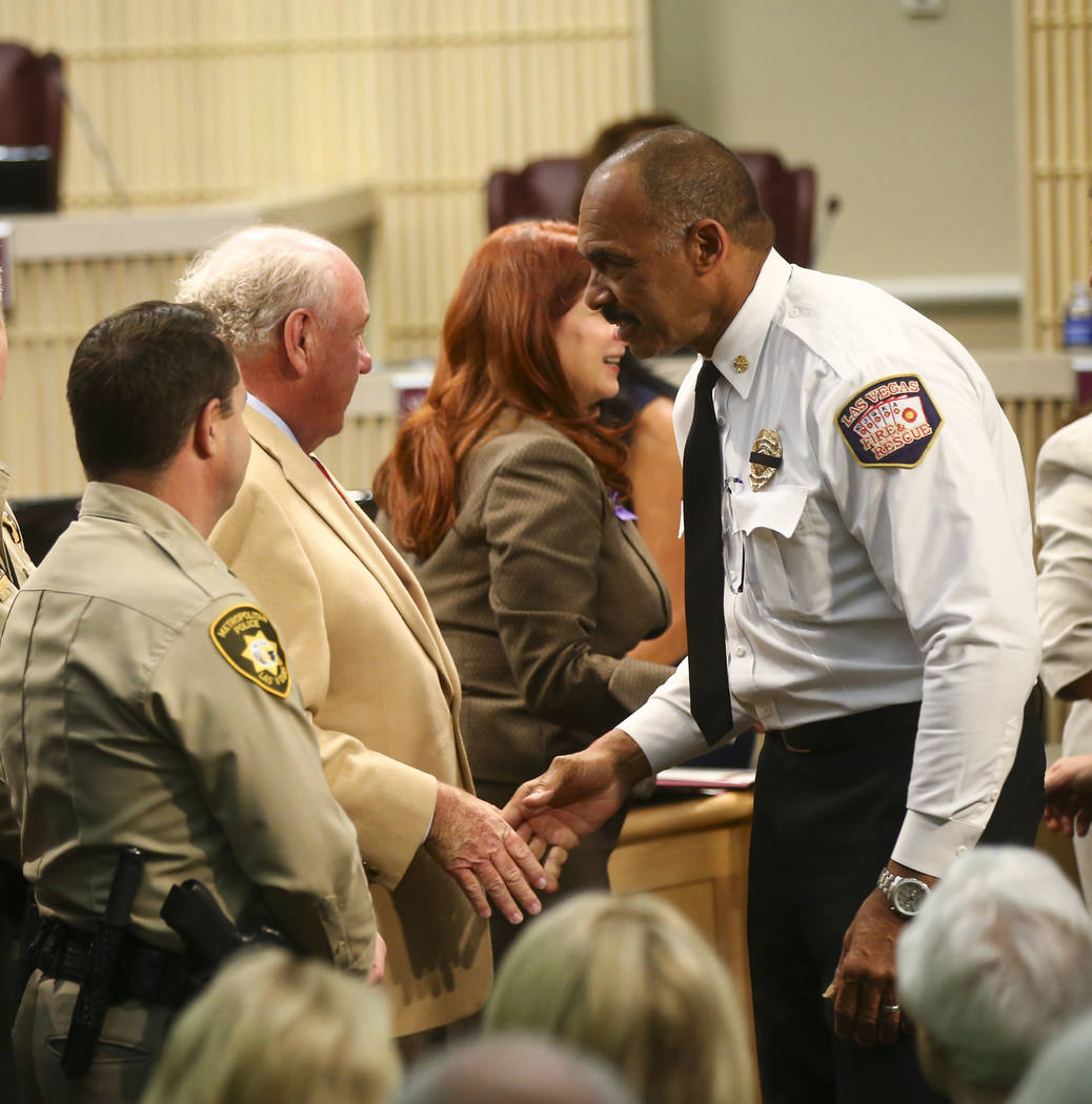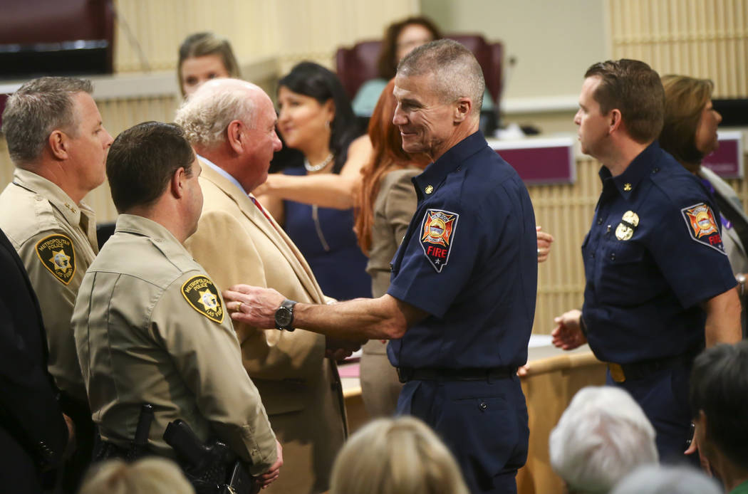 Las Vegas Fire Chief William McDonald, right, is greeted by Henderson City Councilman Dan Shaw as first responders in the Oct. 1 shooting are recognized during a Henderson City Council meeting on Tuesday, Oct. 17, 2017. Chase Stevens Las Vegas Review-Journal @csstevensphoto